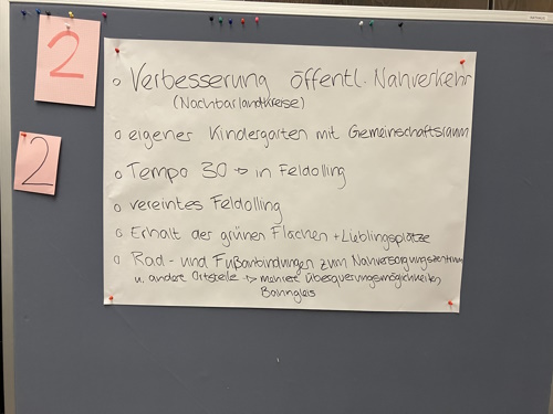 Es gab eine rege Beteiligung an der Veranstaltung, es waren circa 45 Bürger*innen anwesend. Zu 95% aus dem angesprochenen Ortsteil Feldolling.